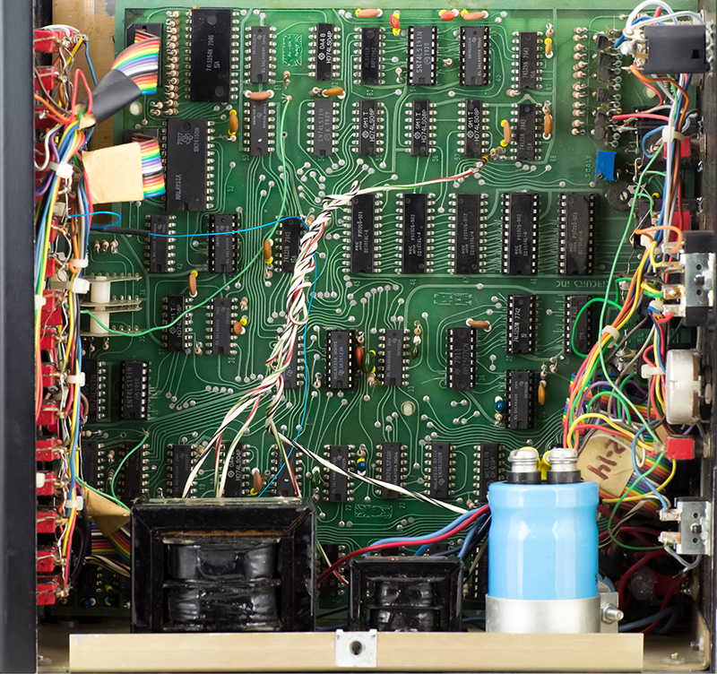 The same owner sent me a second SCI Model 800 Sequencer for repair which is 1980 with serial number 0330. This is the later version with 5 memory ICs for a 20 bit word with 6 bits of resolution for the CV and 14 bits of timing information. It also has a discrete DAC. With only 6 bits of resolution it records semitone values for a near 5 octave range. There is a nice summary on restoring a Model 800 Sequencer late version on the Keith Robert Murray site.