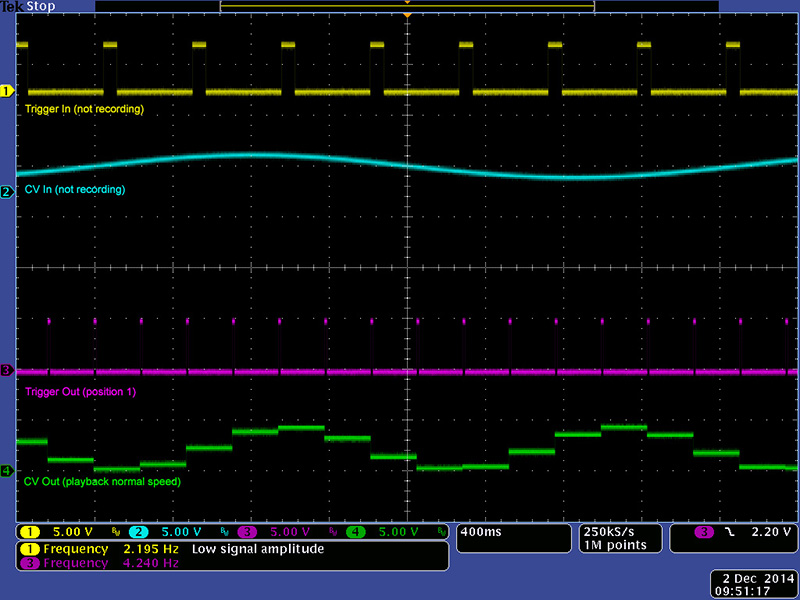 This image shows playback of the CV Out and Trigger Out in position 1 (5V positive trigger). The CV In and Trigger In are on the scope for reference. Note the playback is ~2X faster than the original input signal - something more to investigate.
