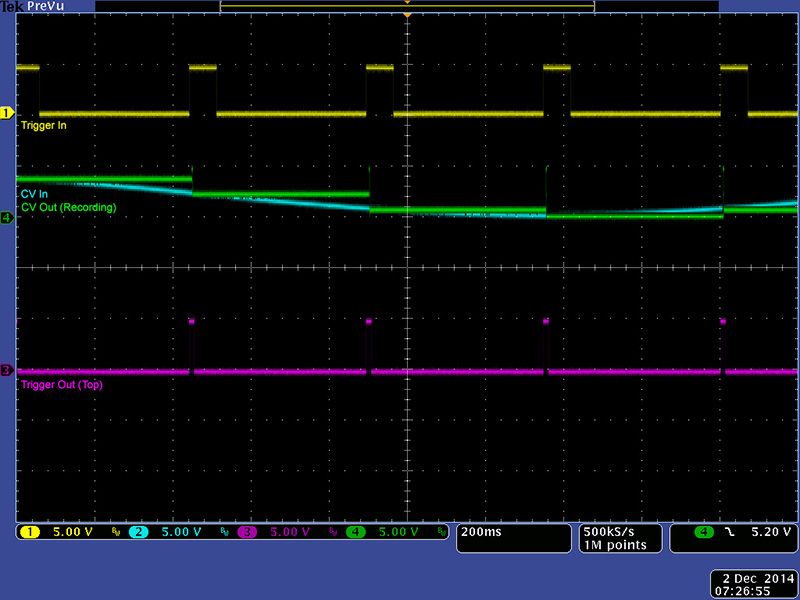 This image shows the CV and Trigger input and the CV and Trigger outputs during recording. During recording the outputs follow the inputs but in this image you can easily see the sampling point of the CV input. There is a very narrow glitch on the CV Out at the sample point. I didn't investigate further but suspect it is the successive approximation cycle. The DAC is used as part of the successive approximation loop and the CV Out comes directly from the DAC.