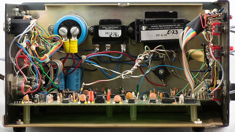 The spacing of the two transformers changed on the late model to better fit the panel. The striped wire bundle in the middle is for a -Slave disable switch that someone added on the front panel. Apparently they didn't have access to wire cutters!