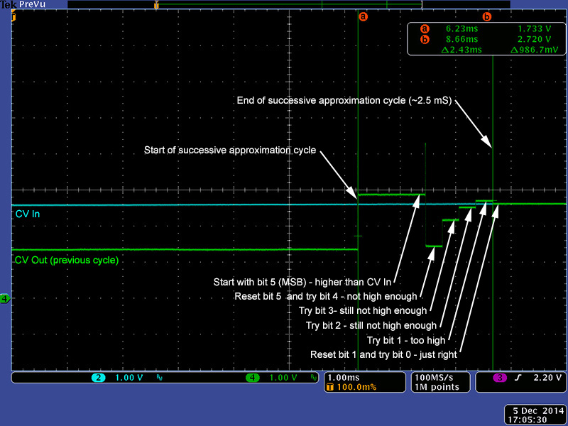 Adjusting the triggering gives us a nice view of the successive approximation cycle. The cycle takes about 2.5 mS and you can see it go through each of the 6 bits to complete the cycle. There might be a bit 0 reset in the successive approximation cycle but there is not enough vertical resolution to discern.