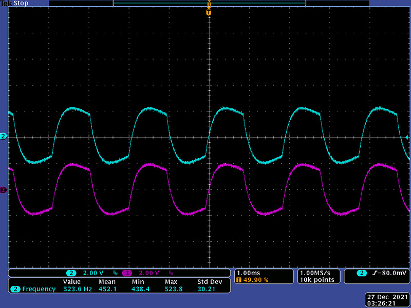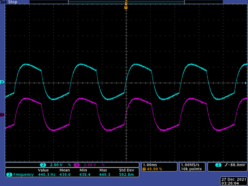 The tuning frequency output is controlled by the VCA level. These photos are with the VCA Gain control at maximum, no audio input, and the Pan control centered. The signal level is +/-2V peak-peak.