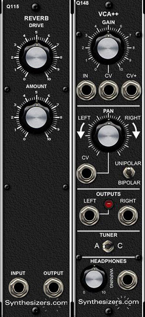 This customer wanted reverb and the features of the Q148. I converted a Synthesizers.com Q115 Reverb and Q148 VCA++ to a single panel Aries format.