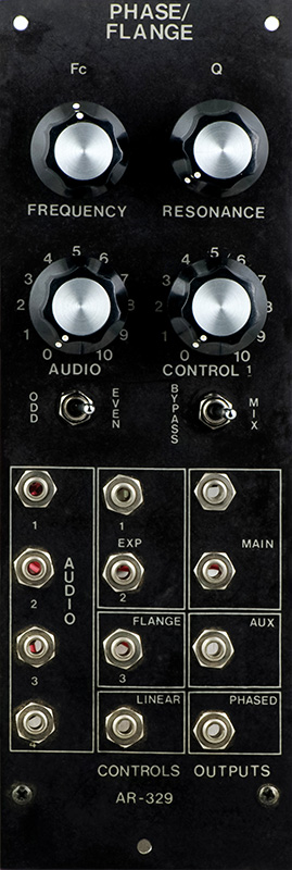 This module features four audio inputs and CV for exponential, flange, and linear. It has outputs for main, aux, and phased and a switch for odd or even.