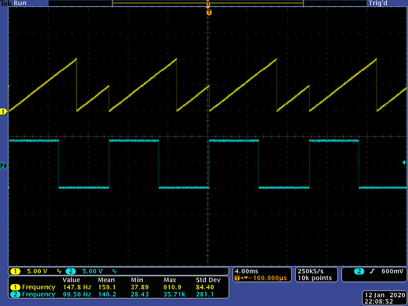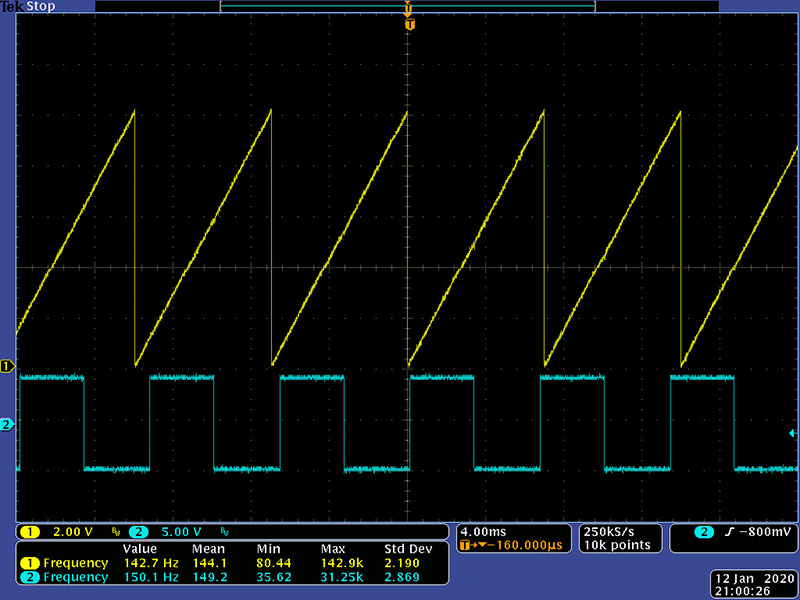 It also has a Pan output. There are two pulse generators in this VCO. The pulse generated from the ramp appears on the front panel. The pulse generated from the triangle does not, but goes to a pan circuit which pans between the two pulse outputs. In these scope photos, the cyan trace is the internally generated pulse from the triangle. The pan outputs are derived from various setting of the pan and pulse width controls. This first image is with the pulse width controls set to 50%.