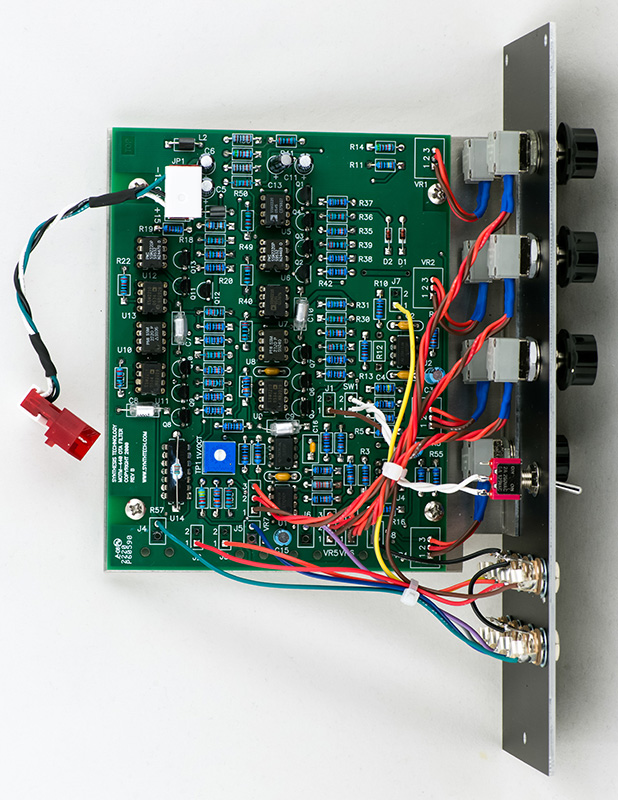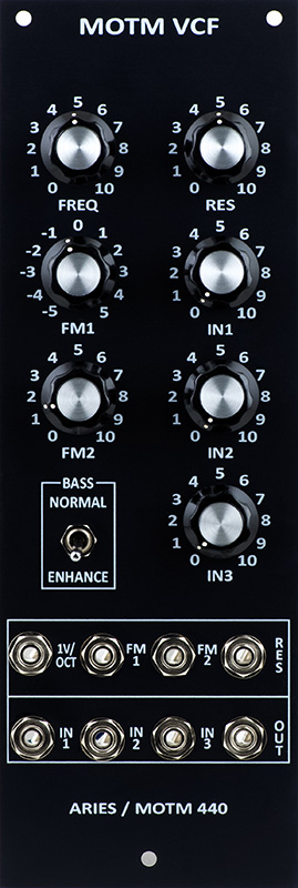 This customer wanted a MOTM-440 in an Aries format. I needed to use small knobs and designed the panel to match the layout of other similar Aries modules. This is a FrontPanelExpress printed panel.