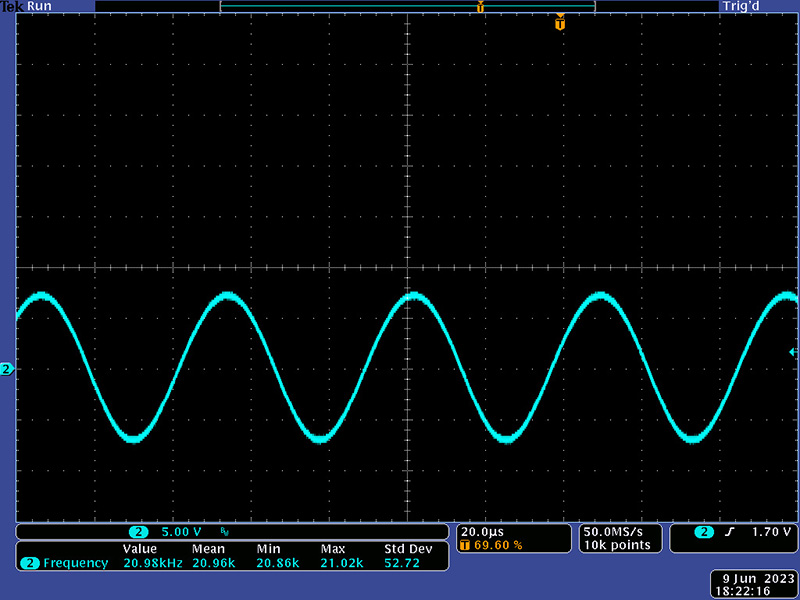 The filter will self-oscillate from 21 Hz to 21 KHz. It won't self-start at 21 Hz but you can adjust it lower once started. Below 21 Hz the amplitude begins to drop.
