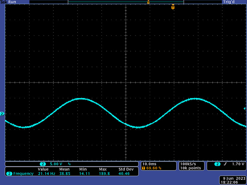 The MOTM modules are a dream to build and operate quite well. I modified the module to operate on Aries 10V CVs for the resonance, FM1 and FM2 inputs. This scope image shows a very nice filtering of a square back to the fundamental sine.