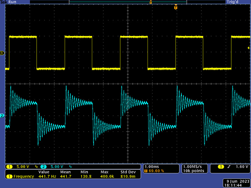 This scope image shows less filtering with resonance. This filter can get a bit hot so the input has been attenuated a bit.