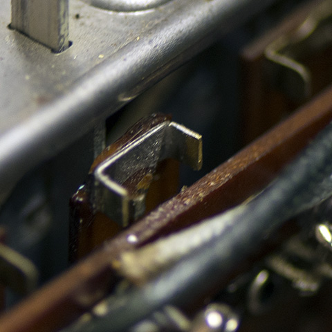 Later I found a well used 205IB so I bought it with the intentions of swapping the preamp and head to the RT-205. Years later I finally got around to working on this tape recorder and decided to simply restore it. The supply reel platform was broken but glued together nicely. The AC cord was brittle and someone had done some poor repairs that I needed to back out. The biggest issue was it would not rewind. This has a complex push switch arrangement and the top of the phenolic which holds the rewind contact had snapped off. I made a new contact and used epoxy to glue it on to the phenolic as seen in this photo.