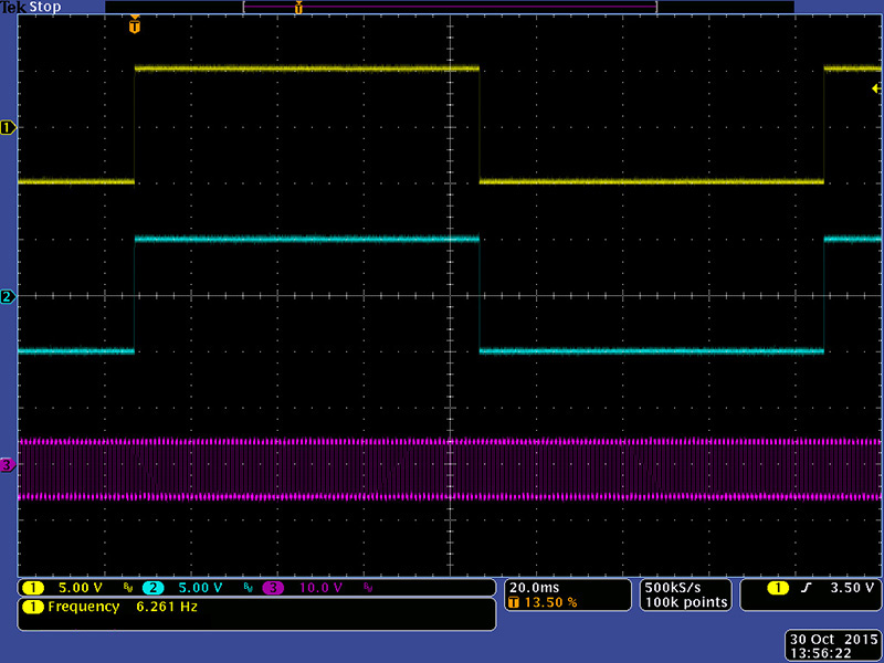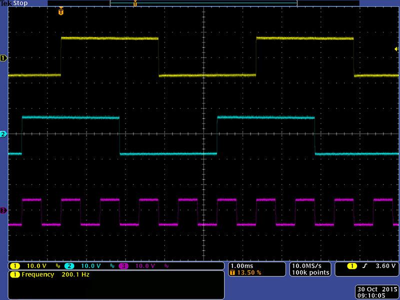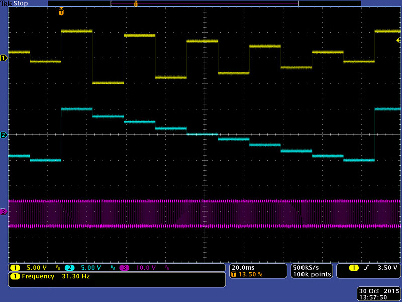 At low frequencies the tilt of the output is readily apparent due to the AC coupling. You can also see that at power up there is a random phase shift between the two banks since the two CD4017s power up at different states.