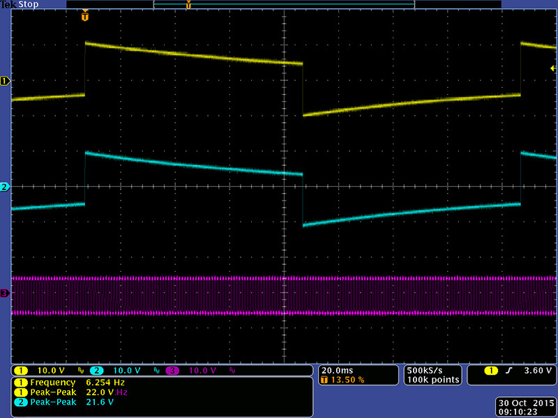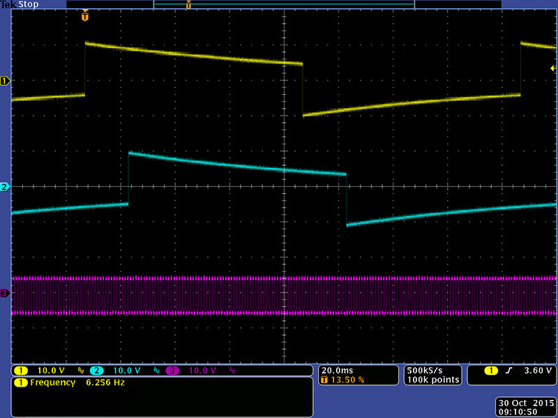 The yellow waveform is the ramp output of A1. Cyan is my HF Out signal which is a nice +/-5V square wave up to 10KHz.