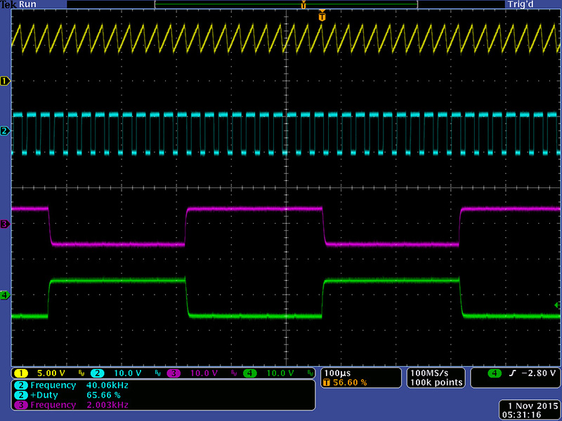 By 40 KHz the duty cycle of the HF Out has shifted to 65% but still is a very usable signal.