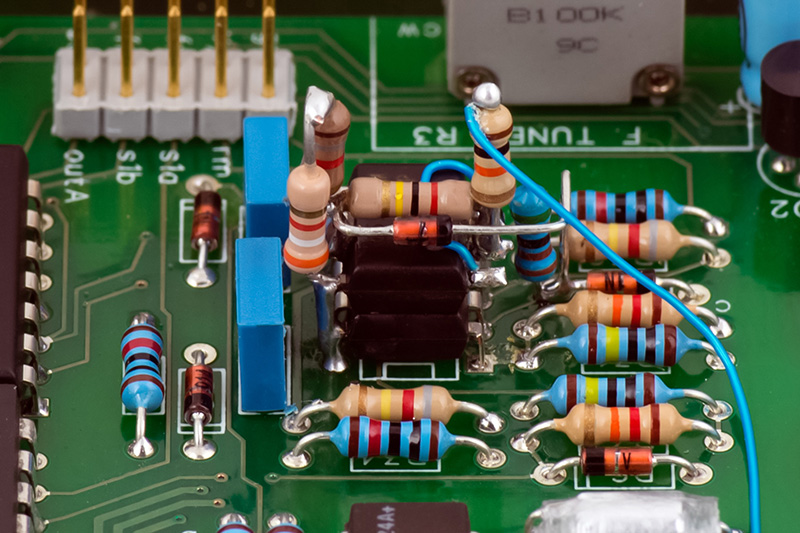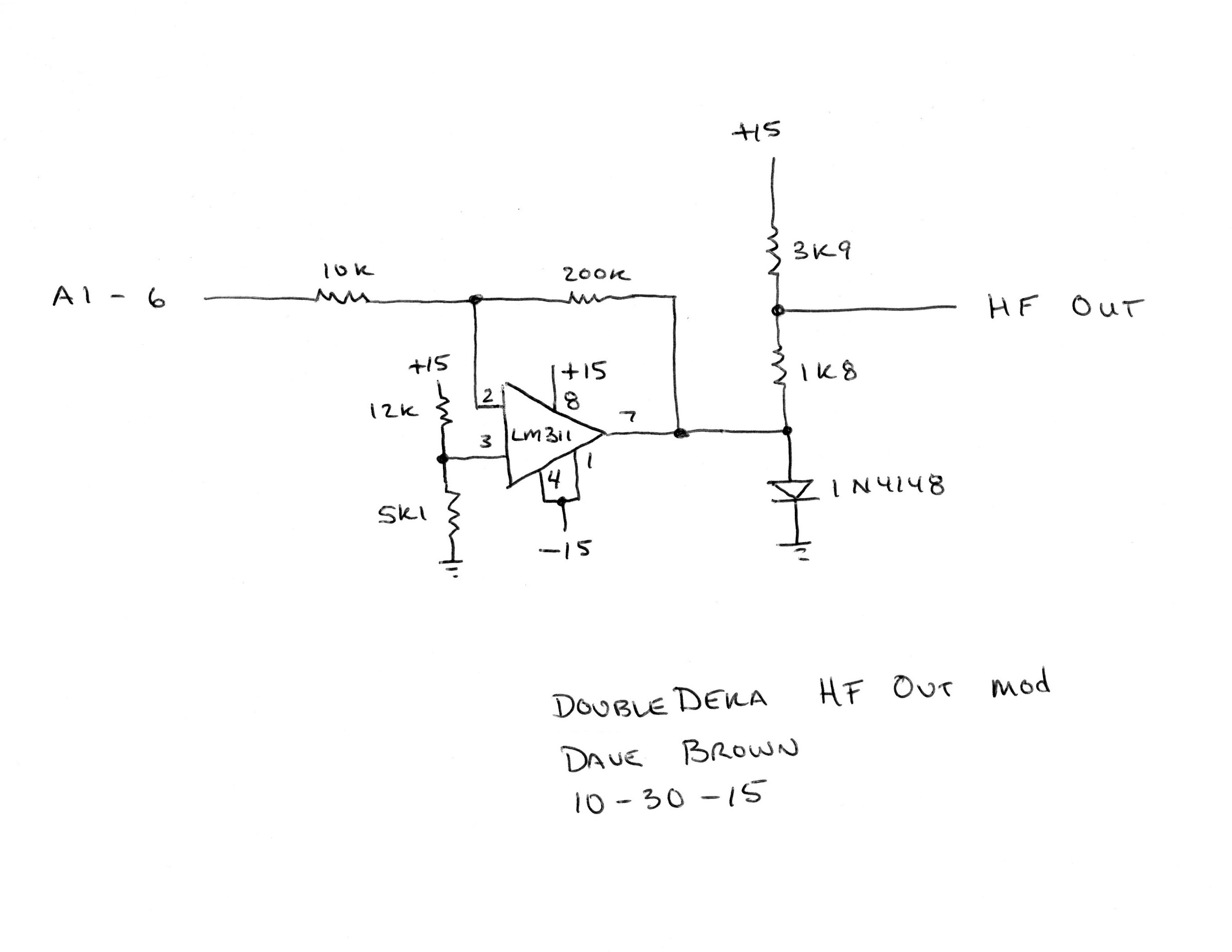 The FCI pins and housing made wiring quite easy. I used some hot glue on the connectors to make sure they stay tight. I originally wired the octave switches backwards. I had assumed the numbers on the PCB connector corresponded to the numbers on the octave switch but they do not. Wire it in reverse. The numbers must refer to the divider chain sequence so 6 on the PCB is the lowest octave and would correspond with the octave switch 1 position. This image shows a different HF Out mod which I later replaced with a comparator circuit.