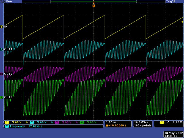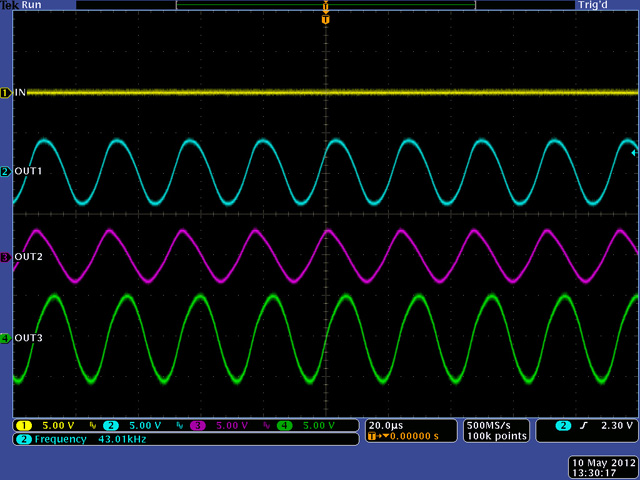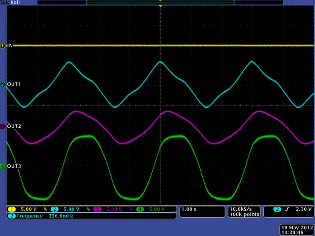 Switching to High-High-High mode increases the frequency back to 3 KHz with a larger Out3 level.