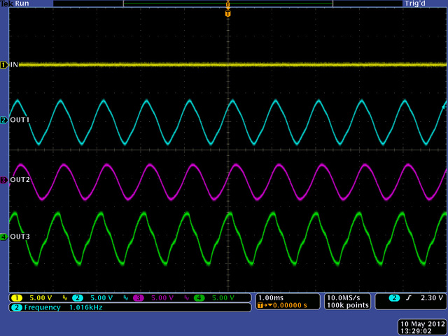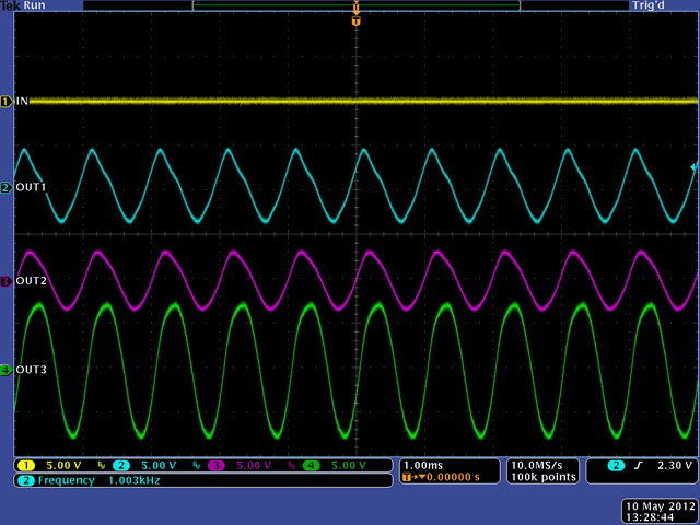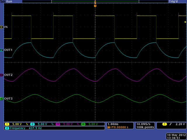This filter has some great performance in each of the four modes. This scope image shows the filter on a 440Hz square wave input in Low-Low-Low mode.