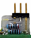 | The three pin jumper was a bit more challenging. Since only 1 pin soldered into the PCB the other pins slide in the plastic housing. I potted the two resistors and pins in epoxy to eliminate any movement and then soldered the jumper in the PCB as shown in this photo. The wire goes to a nearby ground via. | ![]() |