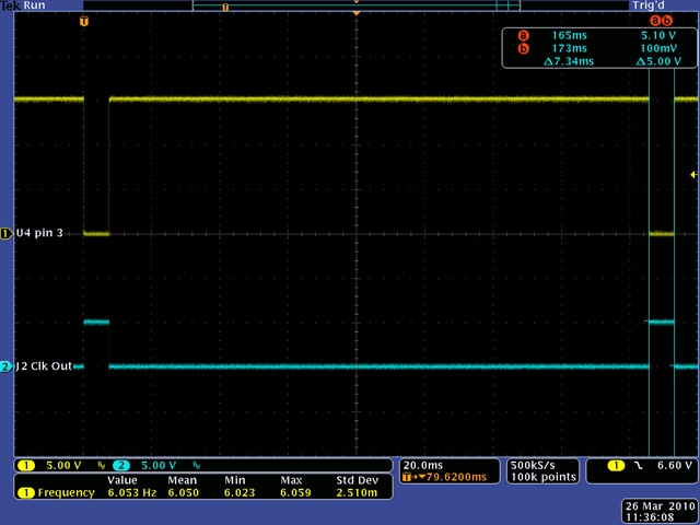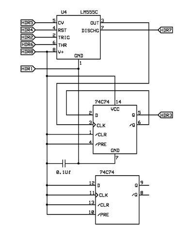 After the module was built, I decided I wanted the Clock Out to be a 50% duty cycle instead of the 7.4mS positive pulse. The rate was high enough that I could divide it by two to generate a square wave. Since U4 was in a socket, I used a header with a LM555C and a 74C74 which required no modifications to the PCB.