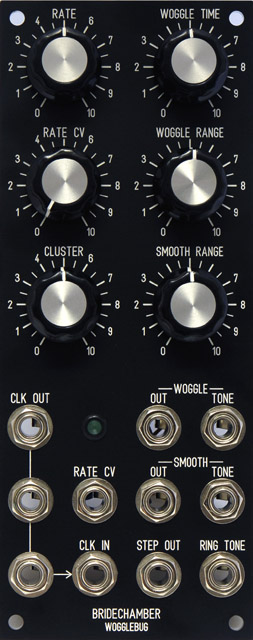 After using this module for a while, I chose to design a FrontPanelExpress panel instead of using the Bridechamber panel because I wanted a Clock Out multiple (right). This provides a single external clock for use with my three ComputerVoltageSource and PSIM modules.