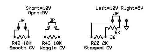 The three traces cut for the clock modification are all hidden and I used R8 and R40 for two of the clock mod resistors. The third resistor is mounted on the rear of the PCB. This photo also shows the three jumpers I added to select the CV level.