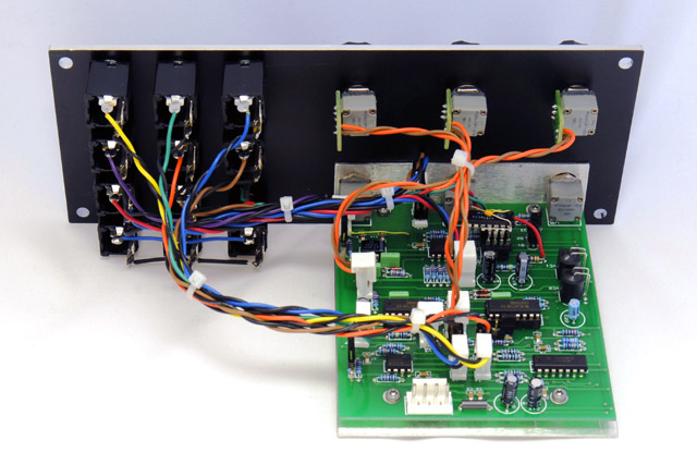 I built a temporary panel by using a spare MOTM-120 panel and printing a matching design on a laser printer. I glued it to the front of the panel and sprayed it with two coats of lacquer. The lacquer seals the page and gives it an orange-peel texture with just a bit of sheen (left).