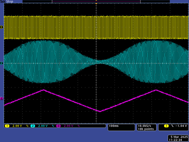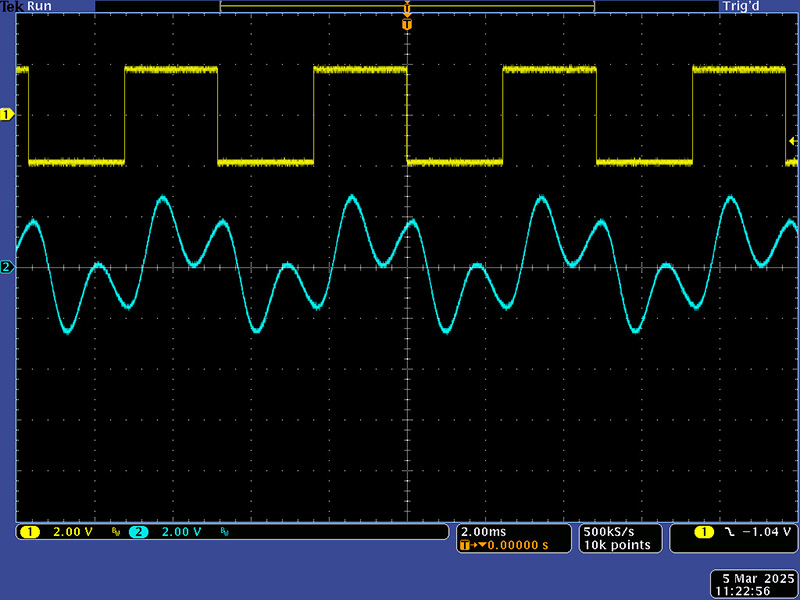 The signal input attenuators and the modulation attenuators provide plenty of control. This scope image is verifying the modulation inputs which attenuate the 200 Hz audio signal.