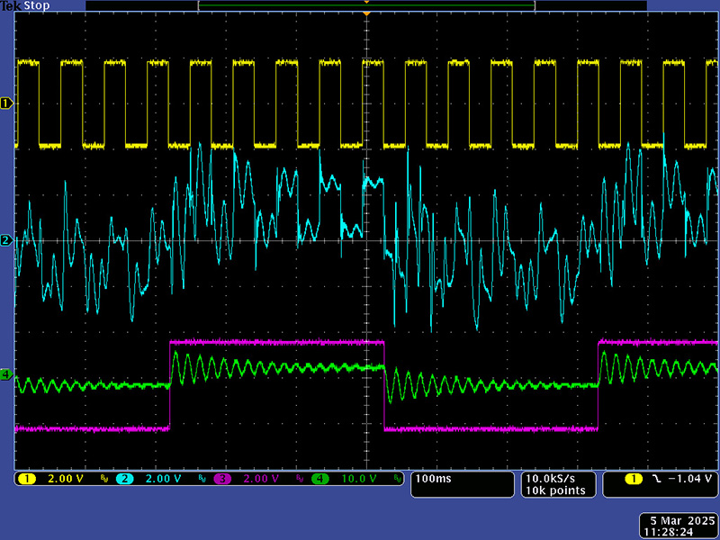 This scope image shows the 24 dB low pass filter being modulated by the multi-mode filter (magenta & green) using the lower switch.