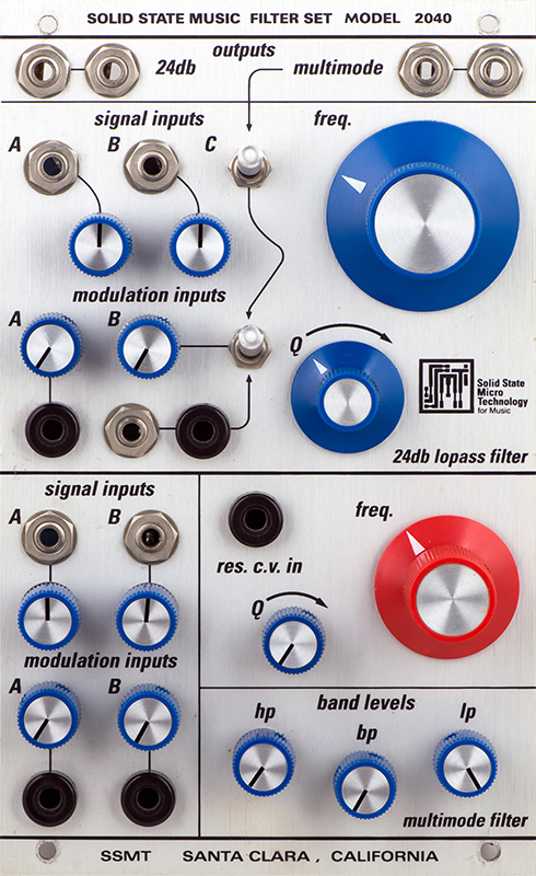 I was sent this dual filter for repair which I had not seen before. The module header says Solid State Music Filter Set 2040 and the logo and footer refer to Solid State Micro Technology. This filter requires a SSM2040 which is hard to find, or a Hearn Morely HM2040 submodule, which this filter uses.