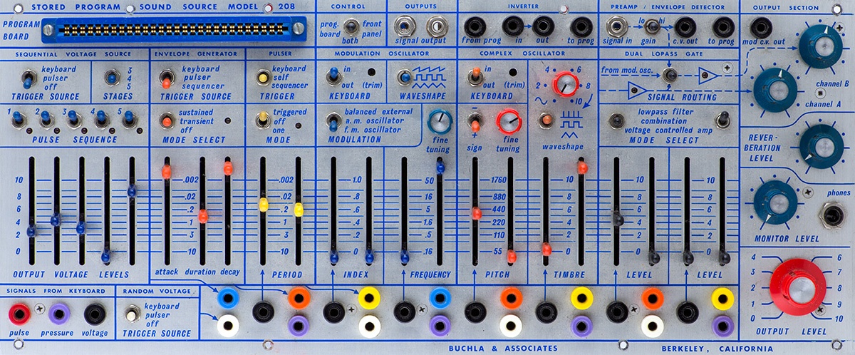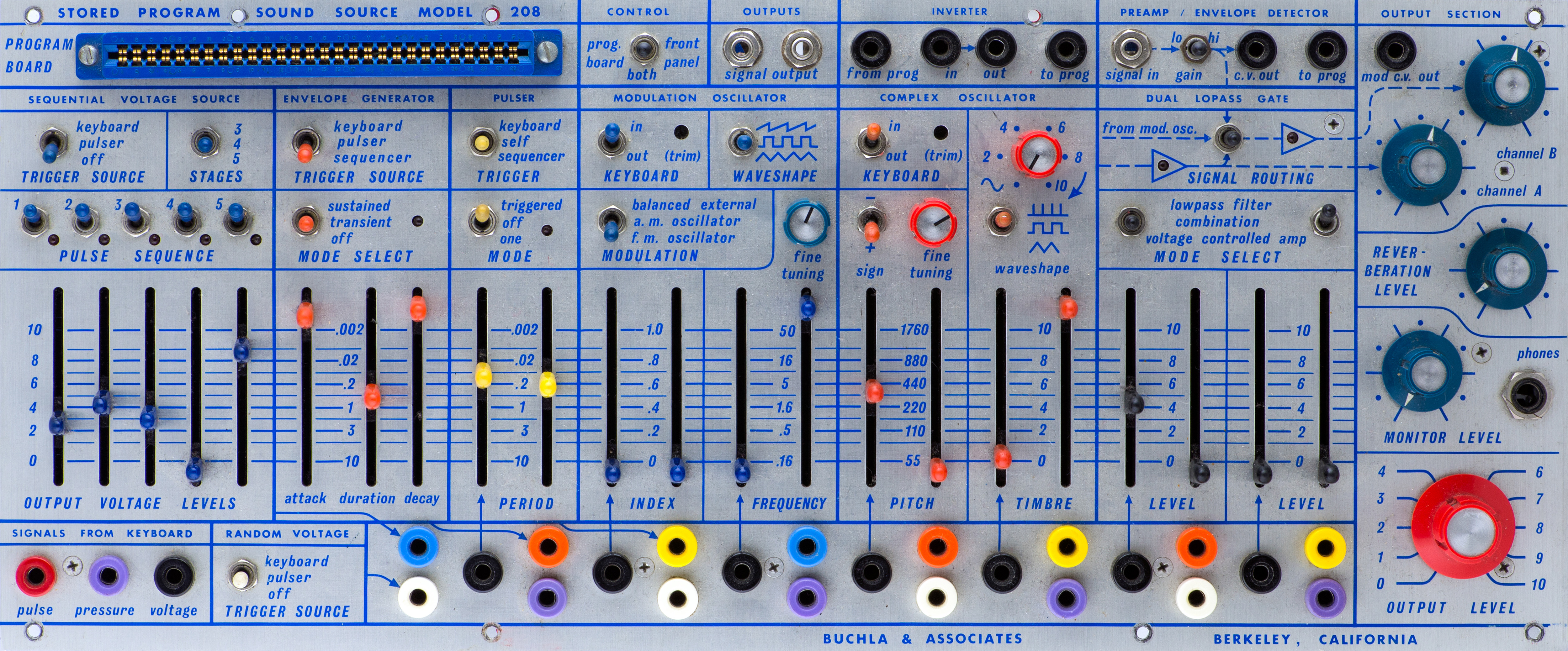 This image shows the complex wavefolding of the sine wave. In the early version of the 208 the timbre circuit is a cross modulation of two triangle waveforms at the same frequency. There are actually two complex oscillators, one is on card 8 and generates the pulse and square waveforms and the other one is on card 9 and generates the sine, triangle, and timbre waveforms.