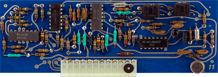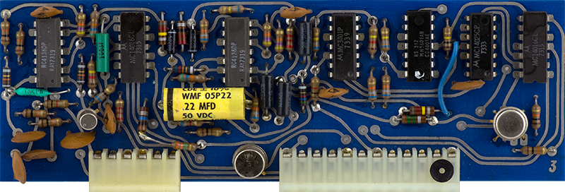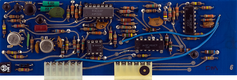 Card 9 is the third of three cards for the complex oscillator. It is actually a second CO that is used to generate the sine wave and the timbre. It is a separate triangle VCO that tracks the CO on Card 8 and is modulated by the triangle output of that VCO when the timbre is increased. The DTL logic gates are driven by comparators and are used to reverse the current of the integrator.