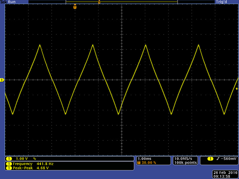 The modulation oscillator operates from 0.13 Hz to 70 Hz with the fine tune control centered. With a CV it can be driven much higher and the waveforms are well shaped.