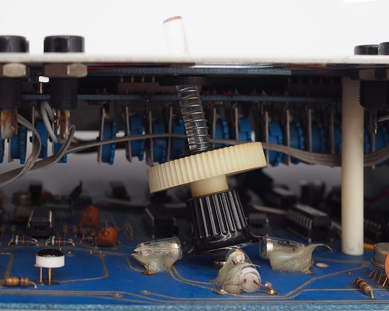 This is the module opened up for repairs and calibration. The PCB at the top consists of the trimmers and pad drivers. The bottom PCB contains all the circuitry and is mostly 4000 series CMOS so there are no rare parts in this module. You can see all the ribbon cable wiring. The gauge is small and the can break easily.