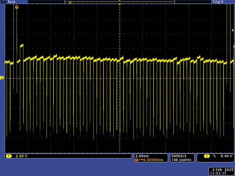 This module is a sandwich of various PCBs. The top two PCBs are for the pads. They are overlayed with an aluminum panel for the controls. Below are two circuit PCBs. One is for the key pad drivers. There are a total of 63 key pads so Don drove this as a 16 x 4 matrix. Each key has a trimmer that you set for equal amplitude. There is a separate trimmer to then set the overall level. I could adjust 62 of the keys correctly. There was one pad that wouldn't attenuate properly but connecting a probe would drop the level. I chose to leave this as it functions correctly. This module uses ribbon cable and is a bit fragile, and one has to move it around to make measurements and then test. It is a bit fragile so I wanted to handle it as little as possible. The tall spike is the unused 64th pad.