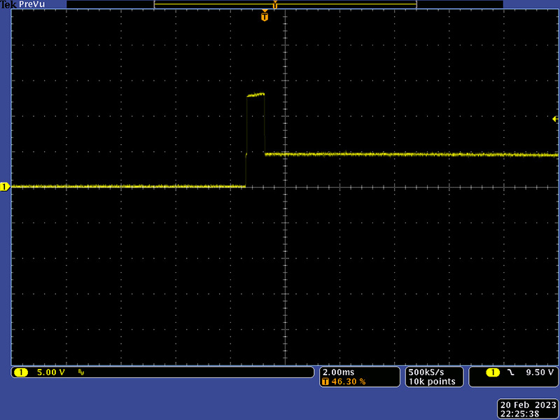This image shows the ~80 mS delay from key press to the pulse output due to the filtering.