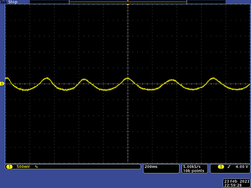 The bend function is a bit wonky. First, it is hard to set the offset because of incidental light. In a boat this is probably best adjusted outside of the boat in a dark room. The CdS amplifier has gain of 4.3X which is then reduced to 0.05X when added to the CV. This unit has been modified with a LED and it easily drove the amplifier to the rails. I reduced the gain to unity and decreased the LED current a bit which gives a nice +/- 2 semitone range.