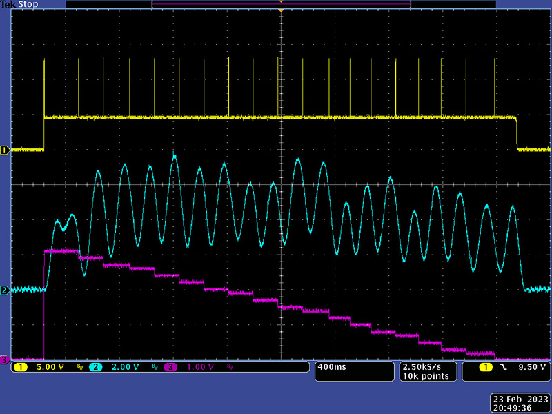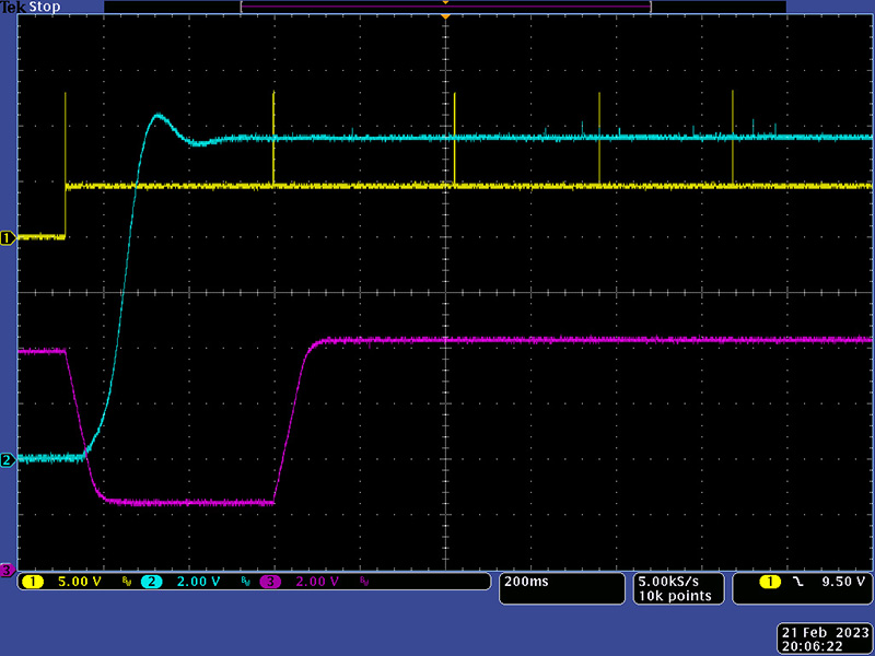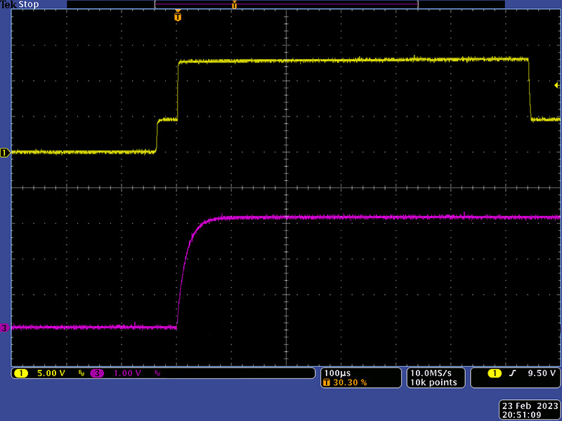 This image shows the delay from pulse to CV stable at about 100 µS. The leading gate step is about 40 µS.