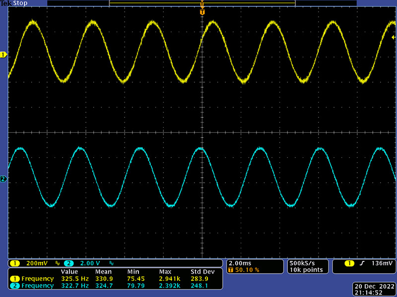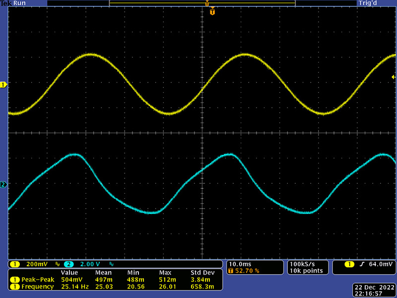 This scope image shows a 500 mV pk-pk 25 Hz input at which the locked oscillator shows distortion.