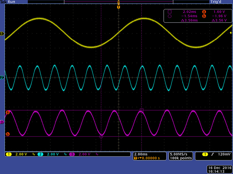 The Sum Null R43 and the Diff Null R44 set the balance between the two multipliers. They have very minor adjustments so you can always just center them. Make these adjustments on the rear PCB. Plug an external sine oscillator into Signal with a +/2V amplitude and set Reference to Int. Adjust the display until you get a stable Sum (cyan) and Difference (magenta) output. I used my cursors to highlight the peaks differ in amplitude.