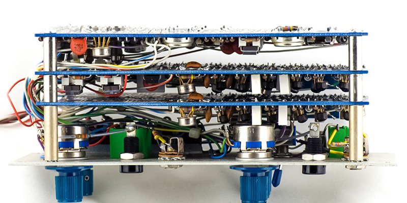 The construction is a three PCB-stack with the front panel controls hand wired to terminal strips. The middle two PCBs are the same and one is half-stuffed. The PCB is the reference oscillator and the 90 degree phase filters. The half-stuffed PCB is the 90 degree phase filter for the Signal input.