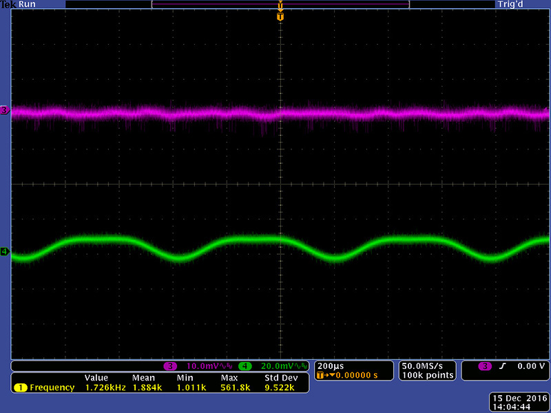 This scope image shows the result of minimizing TP1 with R6. Note I have increased the sensitivity from 20mV to 10mV.