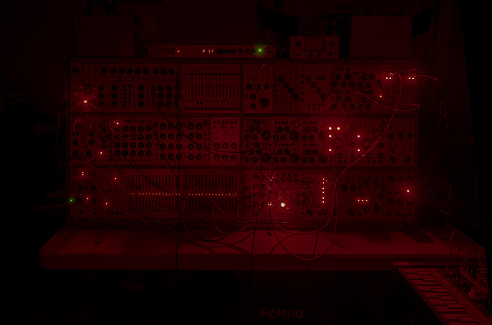 The complete setup also consists of an Arturia Keystep keyboard to my MIDI interface. The Roland amplifier is for my keyboard synth behind this system. My power amplifier is standing vertically on the right.