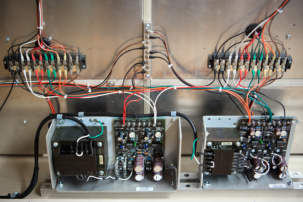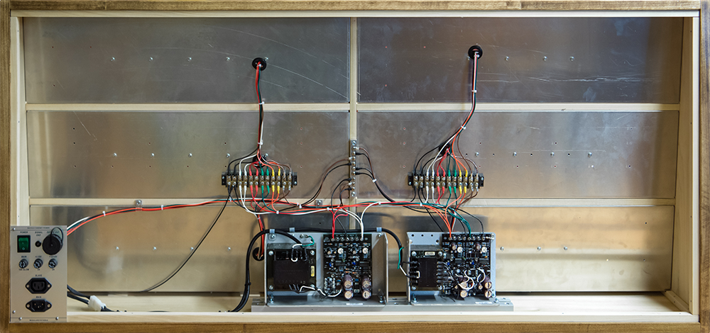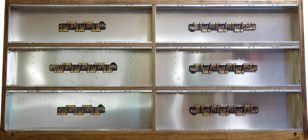 I chose the HCC15-3-A+G for 3 amps of +/-15V and the HBB512-A+G for 1.25 amps of +12V and 3 amps of +5V. I initially planned an all-wood cabinet but the module mounting holes are too close to the edge of a wood mounting rail to have any structure. Metal rails got expensive with the amount of machining required. I chose to build a wood slant cabinet using six 6U boats. I selected boat with Tinnerman nuts since they provide some minor adjustability.