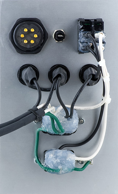 I insulate all mains wiring with heat shrink and cover any exposed terminal with silicone. The two cables terminate in 3 pin Molex connectors for the power supplies.