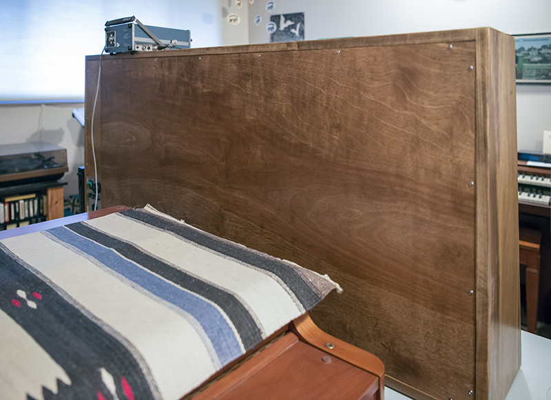 The cabinet does have a back. All of my cabinets are totally enclosed. The B3 is in the foreground and the M2 is in the background. That is my Sony/Tek 323 oscilloscope on top.