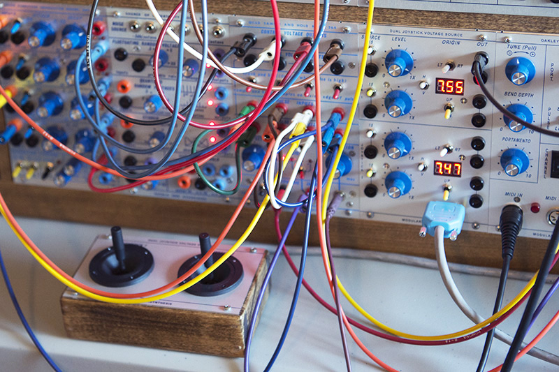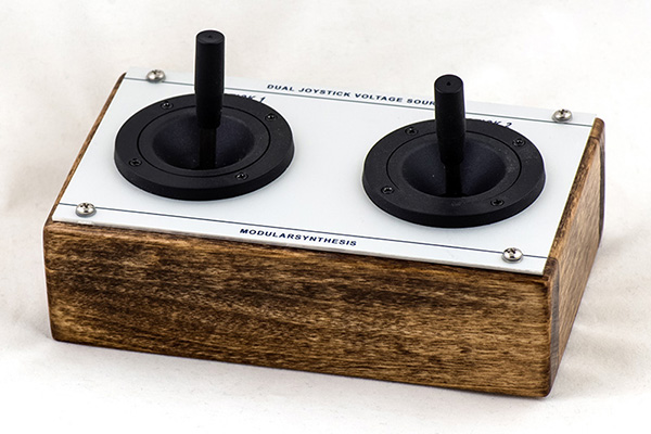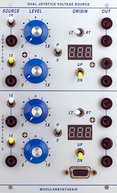 The resulting design supports two joysticks where each axis can be set over a range of 0 to +15V. A switch sets the origin for both axis so operating the joystick will increase or decrease this control voltage. Although there are four controls, I only used two LED voltage modules using a switch to select the axis to be measured.