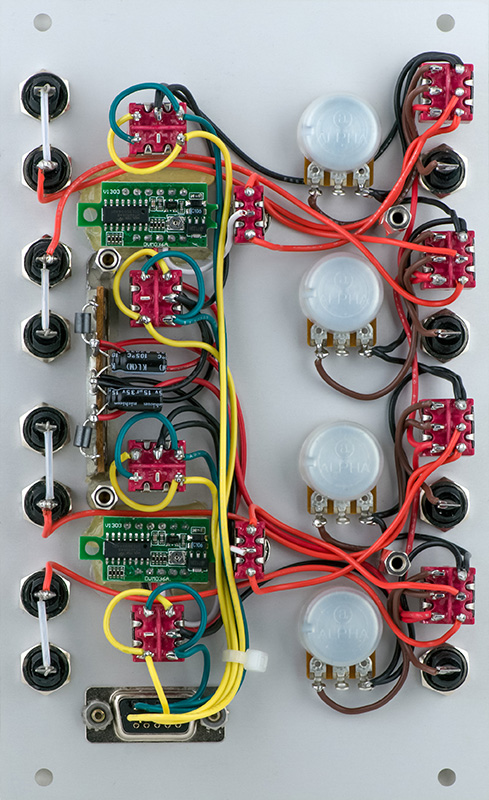 I added another switch to select either +15V or an external input as the source. This allows me to use this module as a general purpose quad attenuator. Both the control and joystick determine the amount of attenuation using an external input. I used rail-rail op-amps so I could operate over a 0 to +15V range or a +/-15V range with the external input.