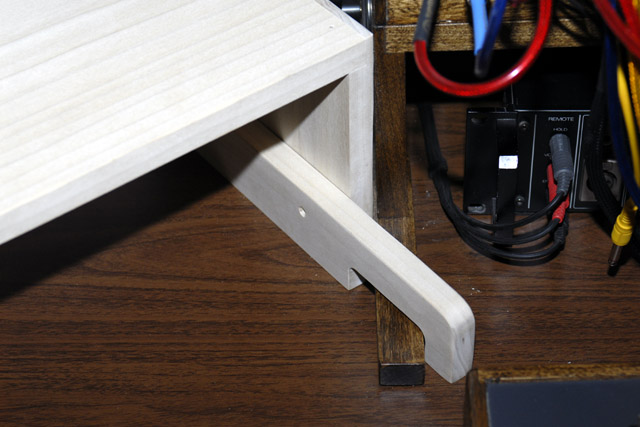 I add a longer foot on the base of the garage for increased stability.  I mount them with screws so I can modify them if necessary.  Since the cabinets sit at angles, I had to come up with this arrangement for the side cabinet foot.