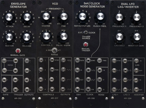 Aries AR-312 EG, AR-314 VCF, AR-316 VCA, AR-317 VCO, AR-318 S&H, AR-324 dual LFO, AR-328 spring reverb and output, AR-332 Dual VCO