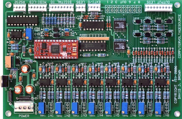 This page is a summary of my 8 channel voltage source module. The history of this module can be found on the Yahoo ComputerVoltageSources group. I co-developed the LCD_Support module, wrote the AVR assembly code, and designed a FrontPanelExpress panel. I also purchased an AtomPro28 to investigate and document the features since a data sheet was not available. The Yahoo group never reached consensus on a set of features and I wanted a full featured version so I decided to complete a PCB design for my own use. I started with the base schematics developed by Grant Richter with contributions from Harry Bissell, and modified them with additional features and functionality. My initial PCB design is definitely not a beginner's Synth-DIY project since it had no solder mask or silk screen, 0.012" ground plane pad clearance, small 0.056" component pads, SMT parts, and over 50 wires to the front panel.