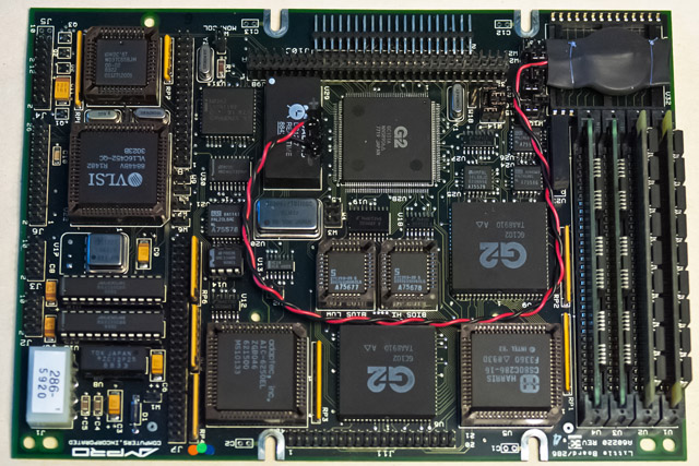 I restored a Tektronix 2402A GPIB controller for or the vintageTEK museum. The BIOS uses a Dallas DS1287 RTC which has an internal battery that was dead. The BIOS defaults are not correct for operation and upon exiting the BIOS the system reboots, so it checks and determines that the battery is dead and again loads the defaults. I found an excellent repair page for the Dallas DS1287. I found it easiest to cut into the sides of the module with an X-Acto knife and then scrape down to the pins with a small screwdriver. You can use the X-Acto knife to cut under the ground pin to separate the battery and solder new wires onto the pins. I used a 3V coin cell that I mounted on top of a pair of unused ROM sockets.